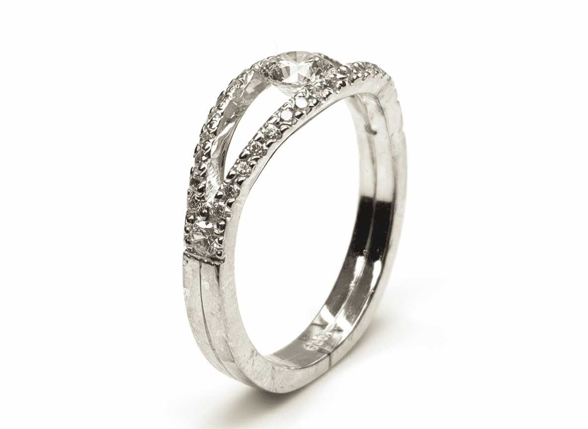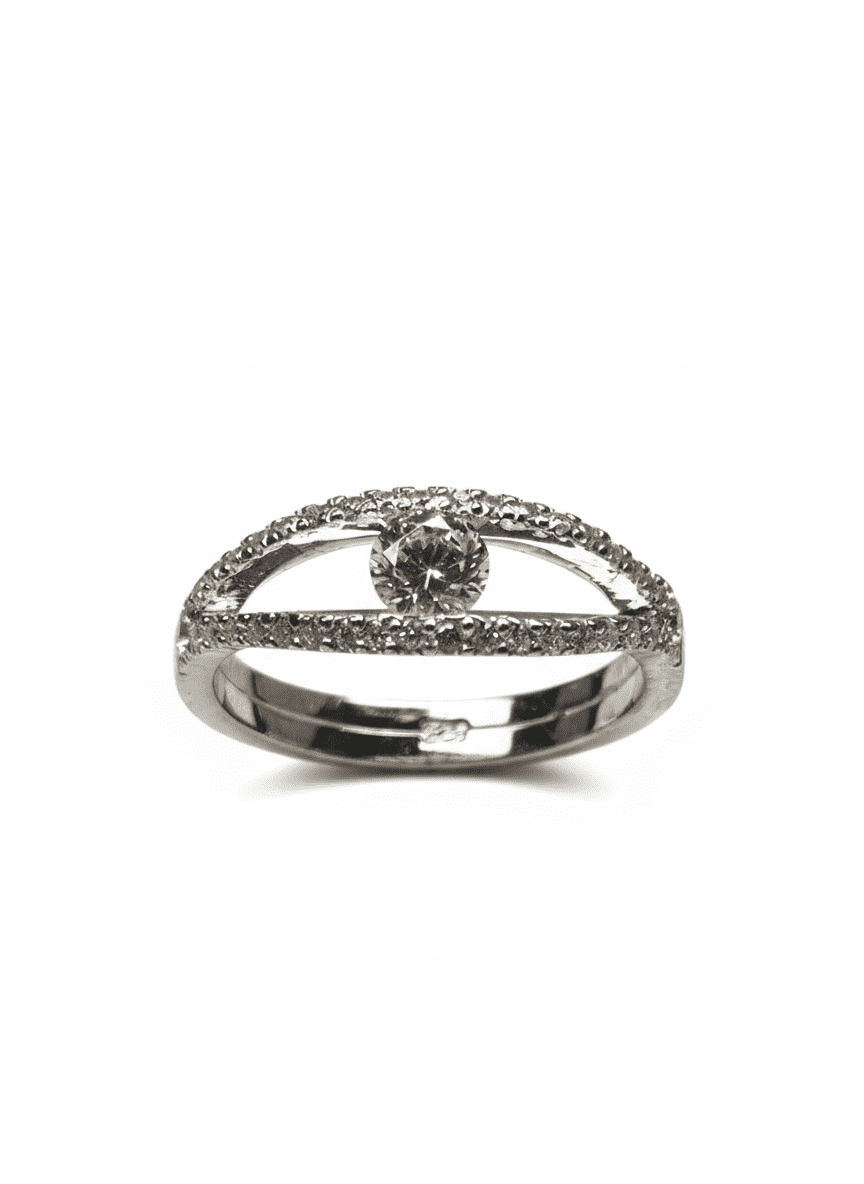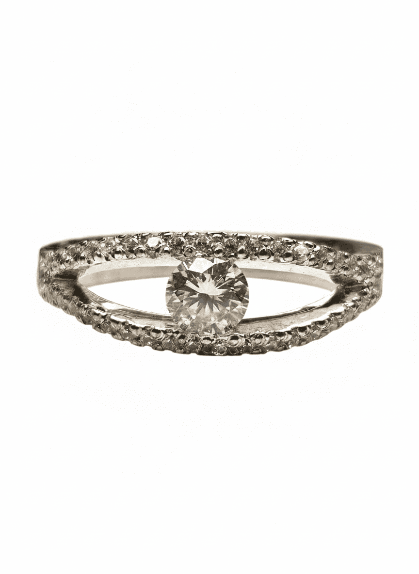 Modern elegance meets brilliant sparkle. This sterling silver ring features a radiant round-cut solitaire embraced by a unique split-shank band. The twin bands are beautifully adorned with pavé-set accents for a stunning, light-catching look. A captivating choice for an engagement or a cherished gift.