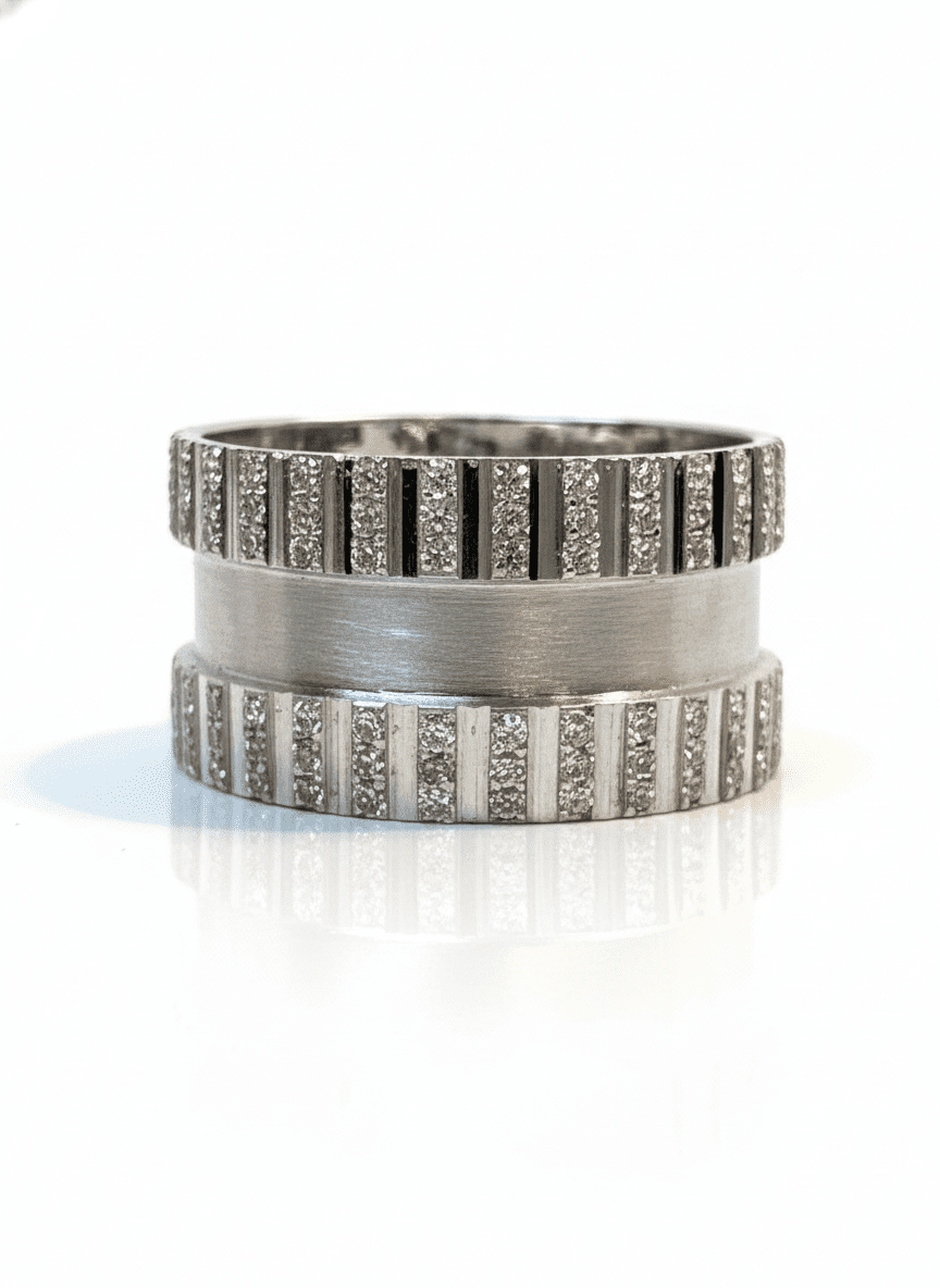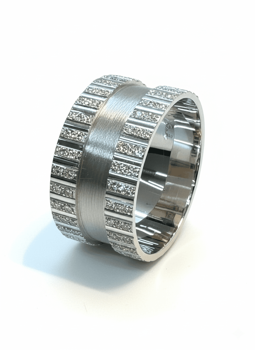 • Design: Wide band with a unique double-row textured edge, reminiscent of a gear or cog.